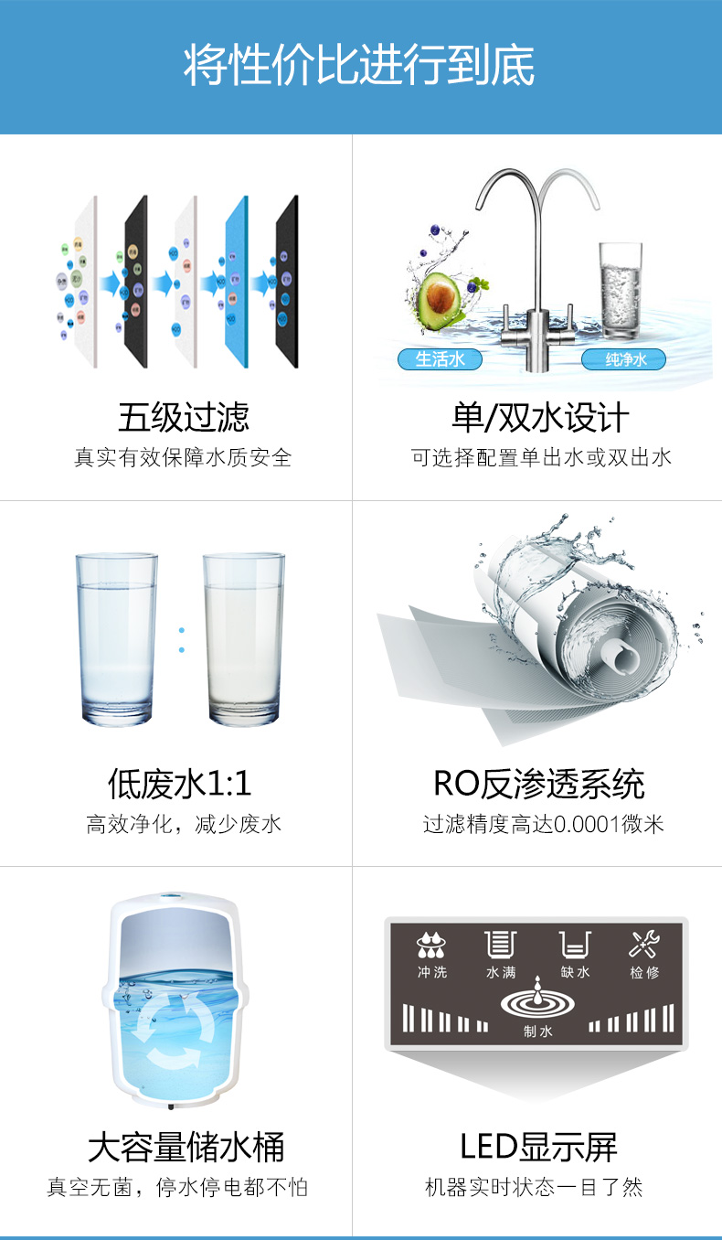 LED显示; 单/双出水设计; 滤芯更换提醒; 不锈钢豪华水龙头; 75G/100G/150G/200G; 食品级ABS材质.