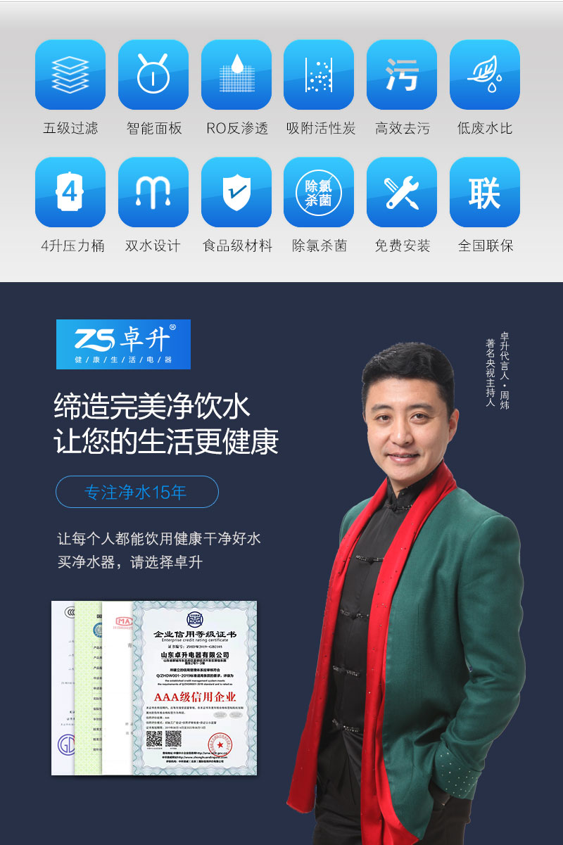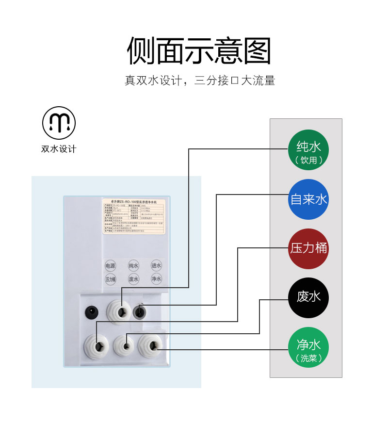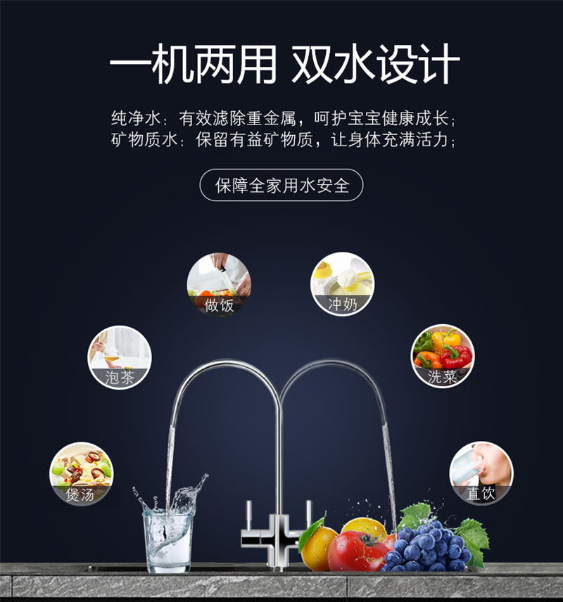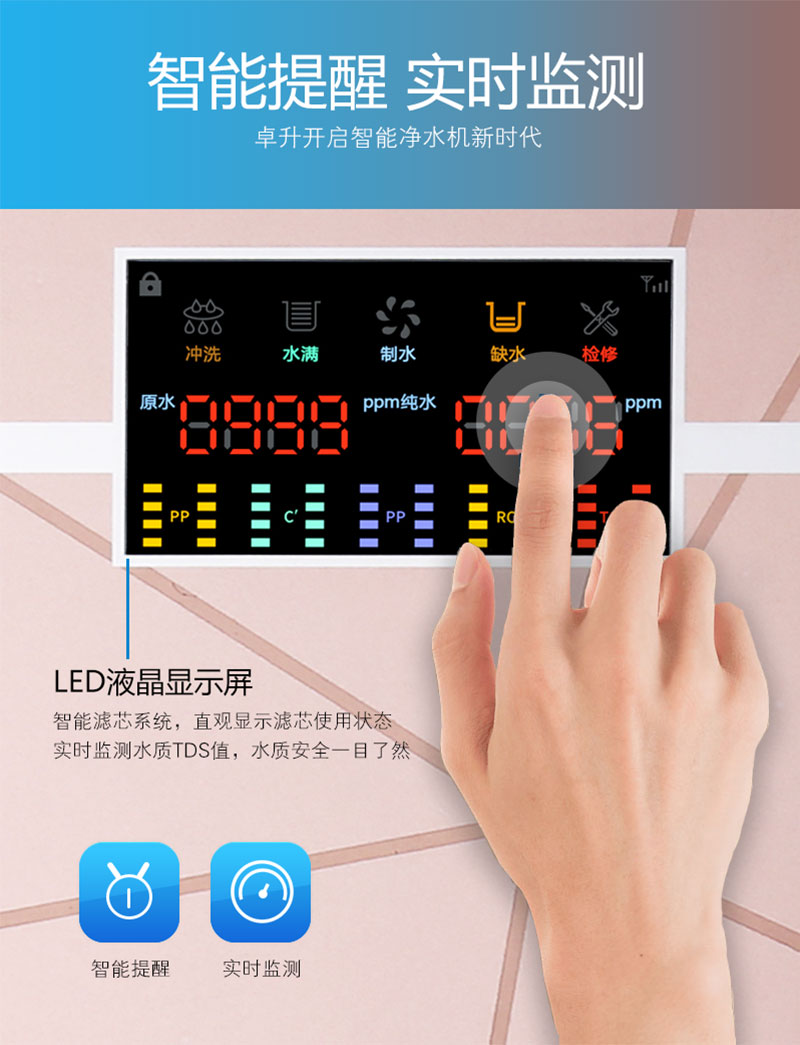 LED显示; TDS值显示; 单/双出水设计; 滤芯更换提醒; 大流量微废水; 外置压力桶; 75G/100G/150G/200G/400G/600G; 食品级ABS材质.