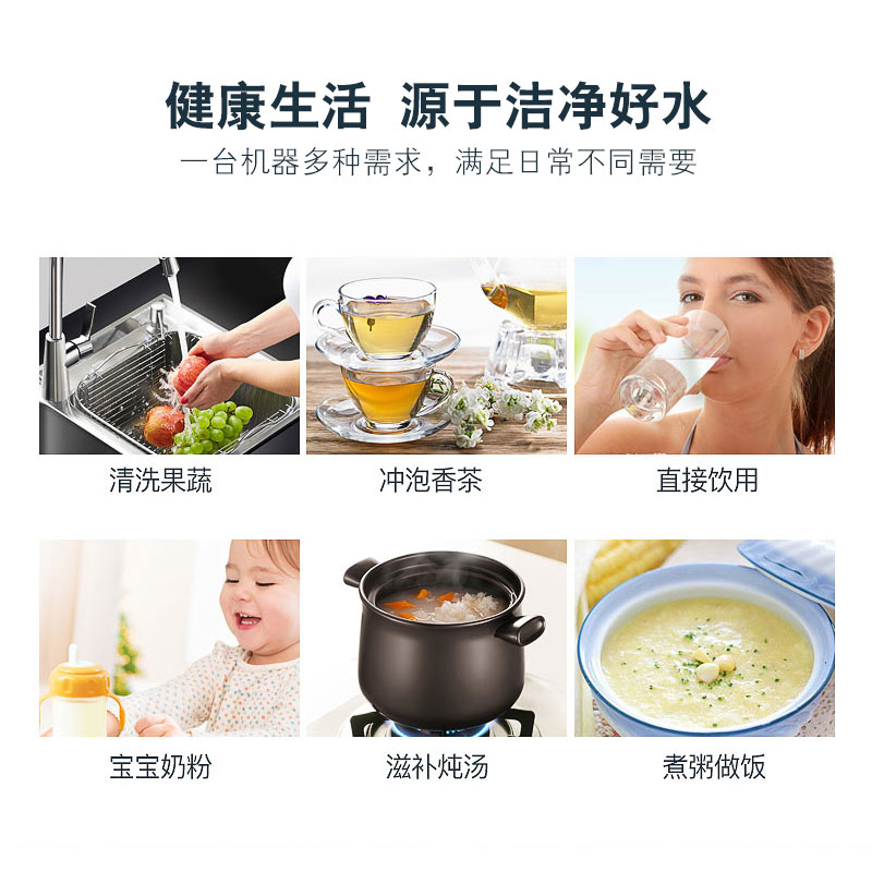 LED显示; 单/双出水设计; 滤芯更换提醒; 不锈钢豪华水龙头; 75G/100G/150G/200G; 食品级ABS材质.