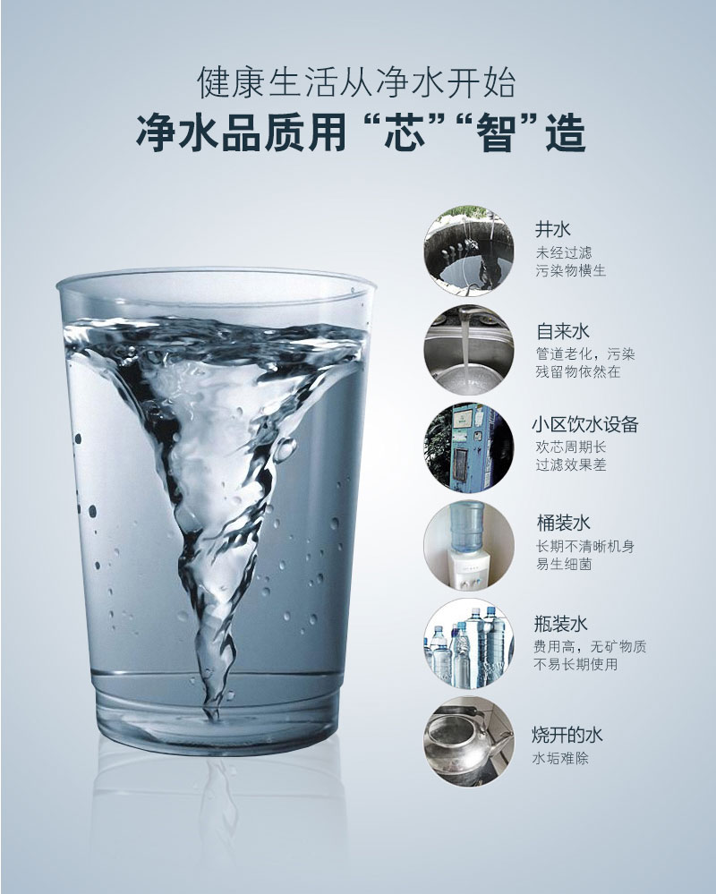大流量微废水; 内置10升大水箱; 内置自吸增加泵; 五级过滤; 冷热一体即滤即饮; 食品级ABS材质.