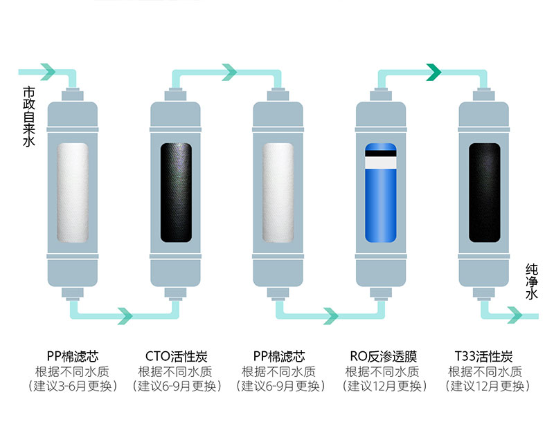 PP棉+CTO压缩活性炭+RO反渗透膜+PP棉+后置椰壳活性炭